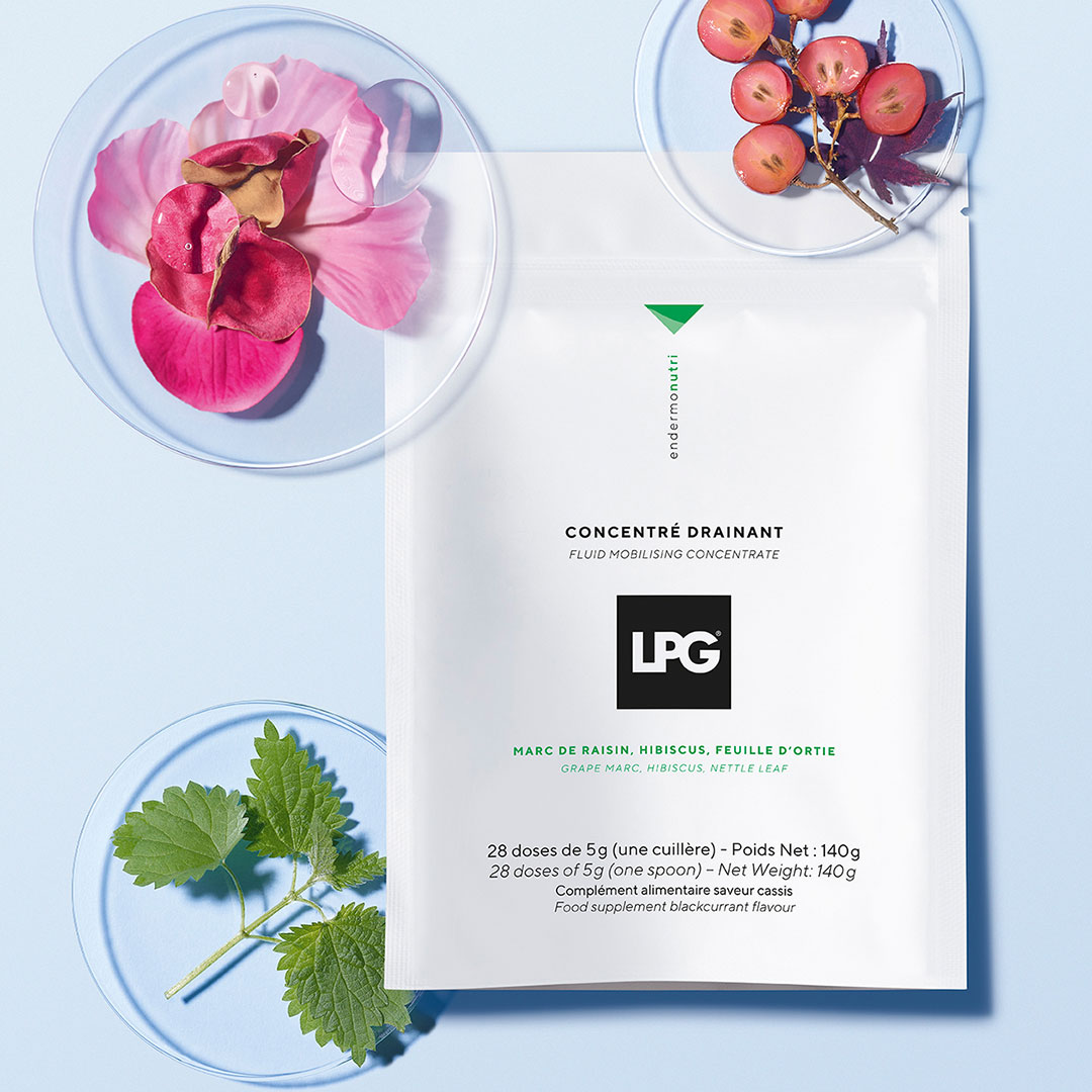 Drena, alivia y deshincha, polvos sabor a grosella negra, sin azúcar, disminuyen la retención de líquidos y alivian la sensación de pesadez en las piernas.